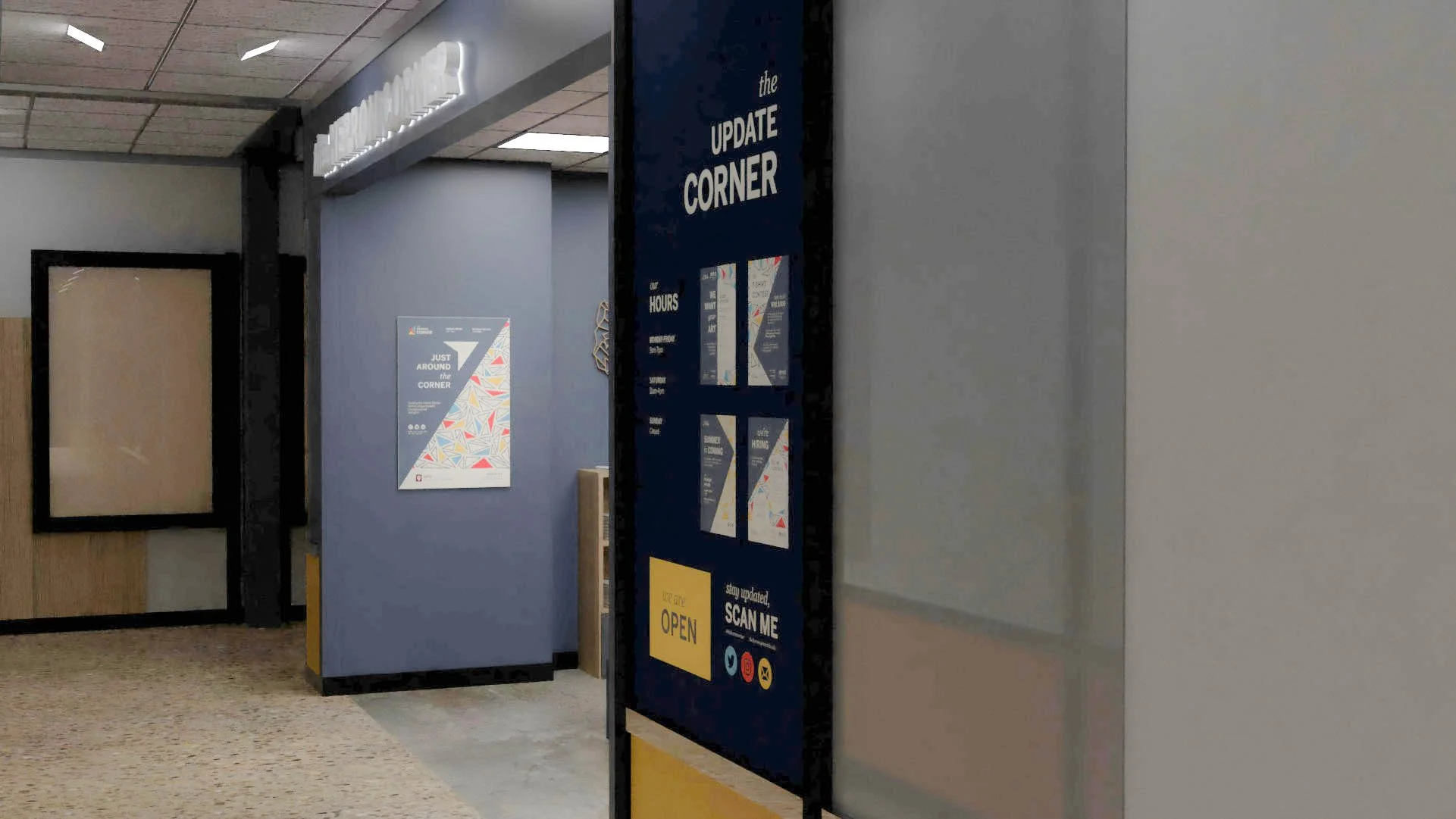 Developing signage to direct students to the location of the store was a vital component to the stores success. As the name suggests, the store is located in a small corner space in the school. I developed 4 signage touch points which included, posters, a mural, flyers, and a sign.