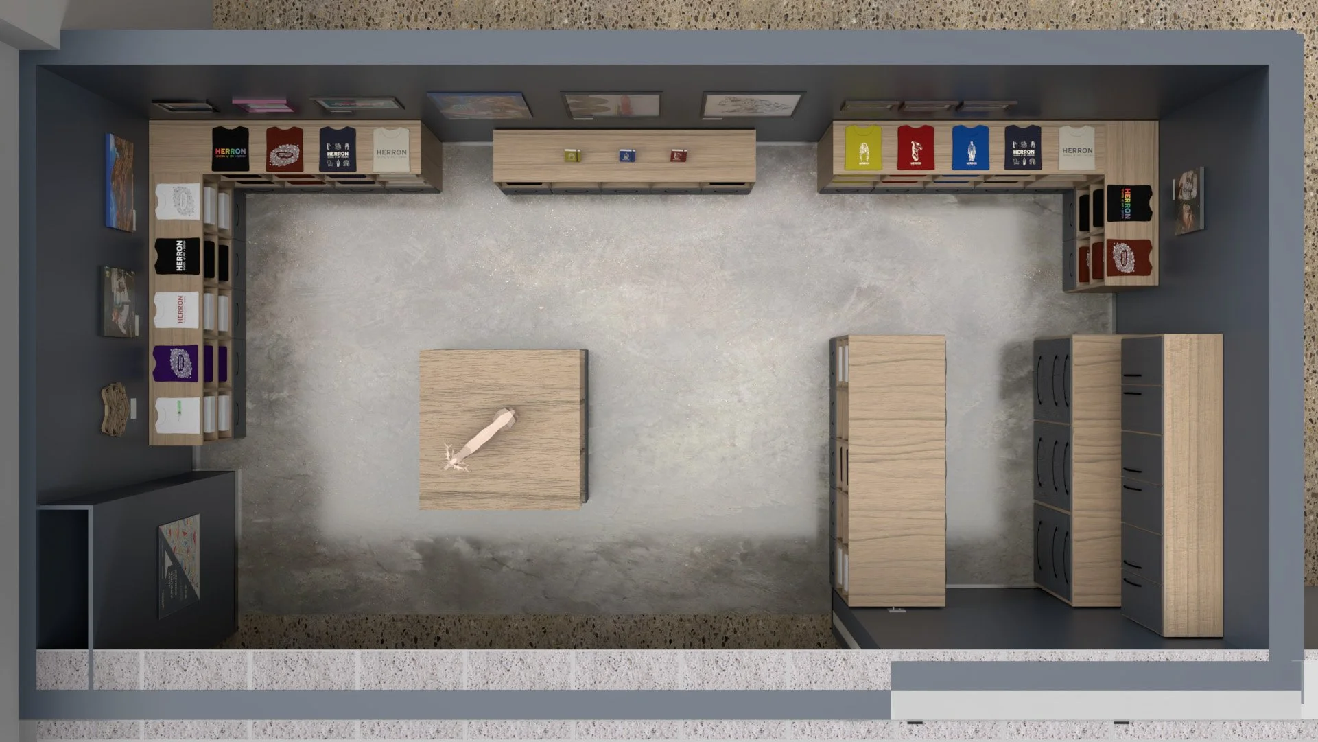 This part of the project was very tricky to iron out. I wanted to use a preexisting space inside of Herron that could be transformed into the store space. I ended up choosing a tiny space tucked away in a corner on the first floor. I was very intentional with how I layed out the store space. I wanted it to be wide enough so multiple students could walk around the space without bumping into shelves.